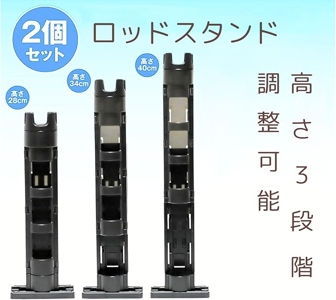 高さと台座位置は3段階調節可能:ロッドホルダーの高さは3段階(28cm・34cm・40cm)に調整できます。釣り竿のサイズに合わせて自由に調節できます。また横転を防ぐための台座の位置も3段階(左・中央・右)に調整できます。