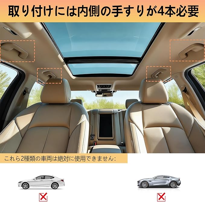 【適合車種】アシストハンドルが4つ装備され、天井高110cm~155cmの車両に適合します。