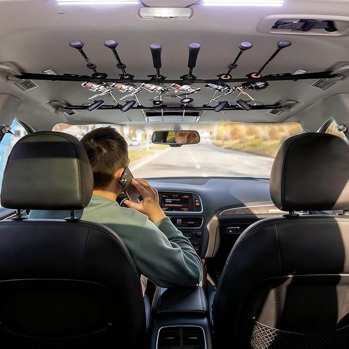 【車内空間を有効活用】:クリップを上向きにすることで、ロッド全体を天井に沿って収納できます。ロッドを収納した状態でも、十分なヘッドルームを確保し、移動や荷物の積み下ろしに支障をきたしません。特にミニバンやSUVでは、スペースを有効活用でき、複数人での移動でも快適な空間を確保します。