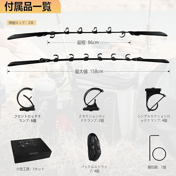 製品仕様:材質:ナイロン+ABS伸縮ロッド:2本、最小伸縮ロッドは86cmに達し、最大伸縮ロッドは158cmに達しますフロントロッドクランプ: 6個2 セクションロッドクランプ: 2 個シングルセクションロッドクランプ: 4 個パックバックルストラップ: 4個
