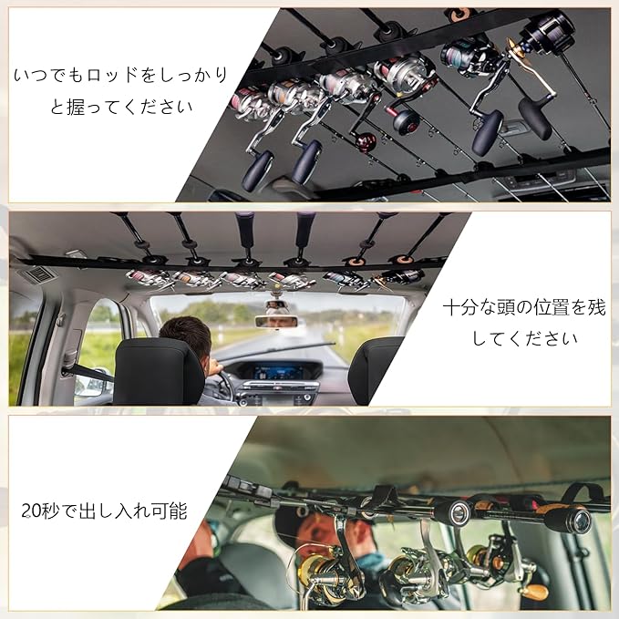 ロッドホルダー 車用 釣り竿収納 釣り道具 ロッドベルト 竿置き 車内 天井 ロッドキャリー ロッドキーパーベルト 6本収納対応 釣り竿収納ベルト 設置簡単 左右の距離110cm~155cm車幅対応 バックルストラップ | KAZESHOP