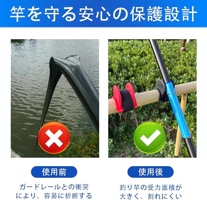 1. 面ファスナーーベルトで簡単設置 どんな場所でも面ファスナーーベルトでしっかり固定可能。釣り場でのセッティングがスムーズで、時間を節約できます。