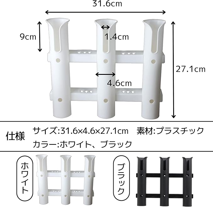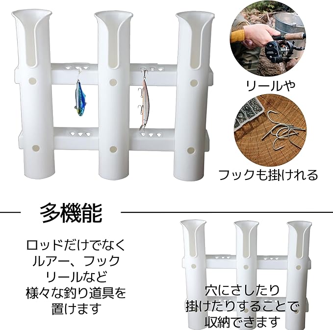 【取り出しがスムーズに】船、ボート、カヤック、カヌーフィッシング、クーラーボックス、キャリーカートなどに取り付け可能なロッドホルダー。 3連構造で、複数のロッドを管理でき、取り出しがスムーズで効率的。 【様々なリールに対応】スピニングリール、電動リールやベイトリールでもしっかりホールドするようにV型の切り欠き部をデザイン。 【収納穴でより便利に】 ロッドだけでなく、ルアー、フック、工具など、様々な釣り道具を収納できる多機能なロッドスタンド。 【簡単取り付け】 取付用のネジとナットがセットになっており、簡単に取り付け可能。 【仕様】素材:プラスチック、カラー:ホワイト/ブラック 【安心の30日間保証】商品品質には万全を機しておりますが、万が一初期不良等発生した場合はご購入から30日間に限り全額返金いたします。 【East Leafオリジナル】East Leafオリジナル梱包にてAmazon倉庫から迅速にお届けいたします。