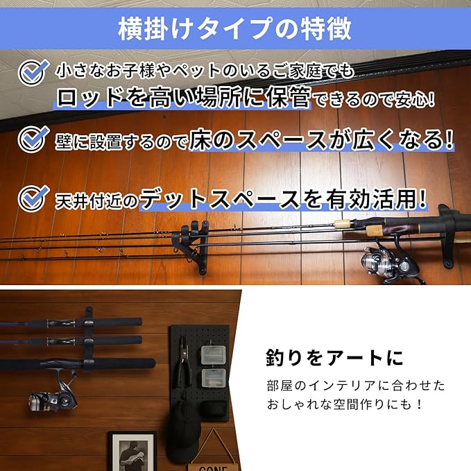 【様々な箇所に取り付け可能】部屋・ガレージ・倉庫等様々な保管場所に取り付け可能、取り付けも簡単でDIY初心者でも安心。ロッドホルダー間の距離は釣り竿の長さに応じて調節できます。また設置の高さも自由なので小さいお子様やペットがいるご家庭でも高めの箇所に設置すれば安全にロッドを収納しておけます。