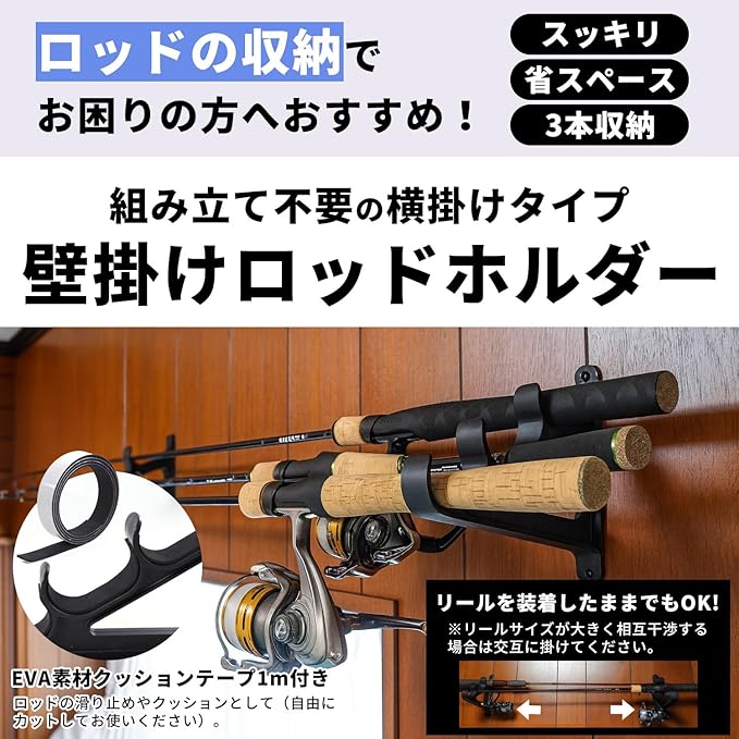 【横掛けタイプの壁掛けロッドホルダー・EVA素材クッションテープ付き】釣り竿の収納にお困りの方へおすすめ!組み立て不要の横掛けタイプの壁掛けロッドホルダーです。大切なロッドをスッキリ・省スペースで収納。リールを装着したままでも掛けられます。ネジで壁に取り付けるだけで、複数本のロッドを安全かつスタイリッシュに収納できます。使用後のロッド整理や、見せる収納としても最適です。ロッドの滑り止めやクッションとしてEVA素材のテープも付属。使用用途や設置環境に応じて取り付けて下さい。