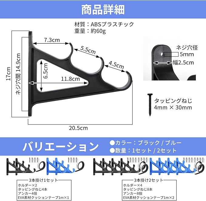 【商品詳細】カラー:ブラック ブルー サイズ:高さ17㎝ 奥行20.5㎝ 幅2.5㎝ 3本掛け1セット(付属品)タッピングねじ(4mm x 30mm)4本 アンカー(6mm)4個 EVA素材クッションテープ1m 3本掛け2セット(付属品)タッピングねじ(4mm x 30mm)8本 アンカー(6mm)8個 EVA素材クッションテープ1m 2 耐荷重約10kg※取り付け箇所の壁強度や厚みが不足していると10㎏以下の負荷であっても落下の危険等ございますので取り付け箇所の強度を必ずご確認ください。