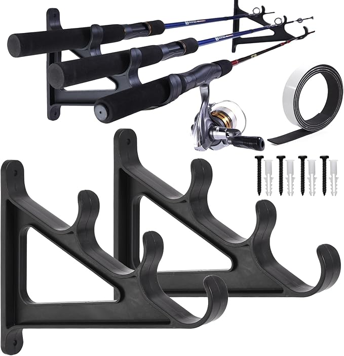 【横掛けタイプの壁掛けロッドホルダー・EVA素材クッションテープ付き】釣り竿の収納にお困りの方へおすすめ!組み立て不要の横掛けタイプの壁掛けロッドホルダーです。大切なロッドをスッキリ・省スペースで収納。リールを装着したままでも掛けられます。ネジで壁に取り付けるだけで、複数本のロッドを安全かつスタイリッシュに収納できます。使用後のロッド整理や、見せる収納としても最適です。ロッドの滑り止めやクッションとしてEVA素材のテープも付属。使用用途や設置環境に応じて取り付けて下さい。 【太めロッドも収納可能】竿掛け幅5㎝ 2・幅7cm 1と広いのでスピニングロッド・ベイトロッド・太めのロッドやたも網等様々な種類のロッドも保管できます。 【様々な箇所に取り付け可能】部屋・ガレージ・倉庫等様々な保管場所に取り付け可能、取り付けも簡単でDIY初心者でも安心。ロッドホルダー間の距離は釣り竿の長さに応じて調節できます。また設置の高さも自由なので小さいお子様やペットがいるご家庭でも高めの箇所に設置すれば安全にロッドを収納しておけます。 【丈夫な素材で長持ち】丈夫なABSプラスチック素材で長持ちし安定してロッドを収納できます。耐荷重約10kgなのでロッドだけでなく色々収納可能 真ん中の三角スペースを活用することで、4本目を収納したりハンガーやS時フックを引っ掛け小物や服を吊るしたり様々な使い方ができます。 【商品詳細】カラー:ブラック ブルー サイズ:高さ17㎝ 奥行20.5㎝ 幅2.5㎝ 3本掛け1セット(付属品)タッピングねじ(4mm x 30mm)4本 アンカー(6mm)4個 EVA素材クッションテープ1m 3本掛け2セット(付属品)タッピングねじ(4mm x 30mm)8本 アンカー(6mm)8個 EVA素材クッションテープ1m 2 耐荷重約10kg※取り付け箇所の壁強度や厚みが不足していると10㎏以下の負荷であっても落下の危険等ございますので取り付け箇所の強度を必ずご確認ください。