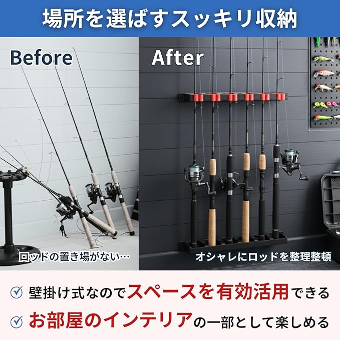 最大6本収納できるロッドスタンド(ラック)です。 縦置きと横置きをご用意しているのでお好きな方をお選びください。
