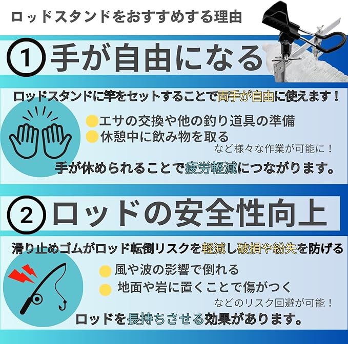 【手が自由になる】竿置きとしての役割を果たすロッドスタンドを使用することで待ち時間を自由に使用することが出来ます。またロッドが固定されることで餌が自然に泳ぐため魚に不要な警戒心をあたえることが少なくなります。