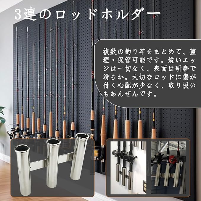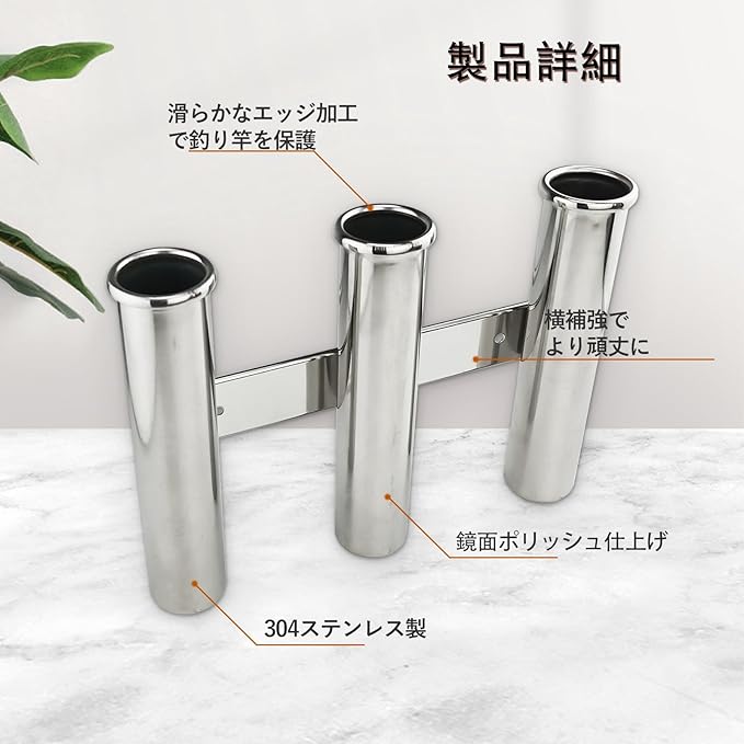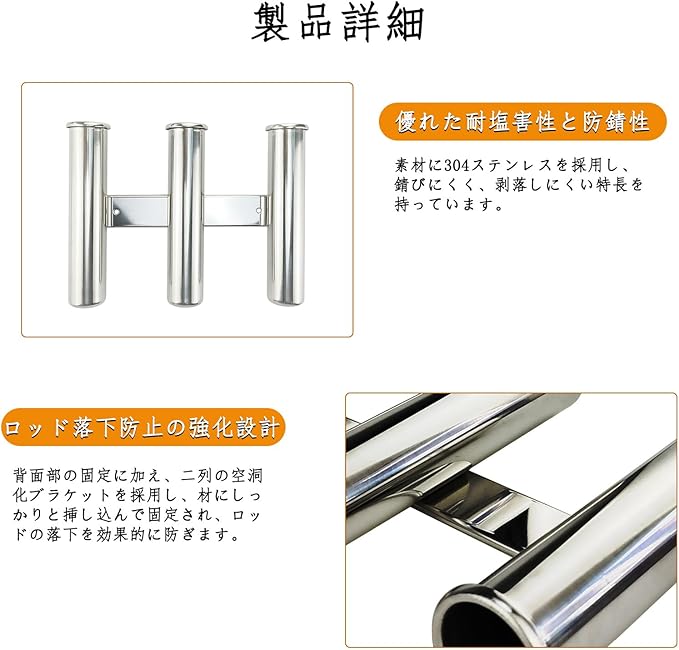 ジンバルピン式ロッドストッパー搭載:各ホルダーの底部に「ジンバルピン」を装備し、ロッドの根本を確実に固定し、ボートの揺れや衝撃でも釣り竿が外れたり、グラついたりするのを効果的に防止し。釣りをサポートする設計です。
