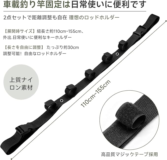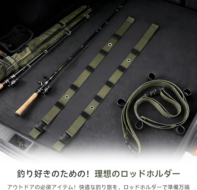 5. 耐久性抜群 & マルチシーン対応 本体ストラップには、摩擦や引っ張りに強い高密度ナイロン素材を採用。長期間の使用や過酷な環境にも耐える耐久性を備えています。釣り竿はもちろん、巻物や小物類の車内収納にも応用でき、車中を常に整理整頓された快適空間に保ちます。