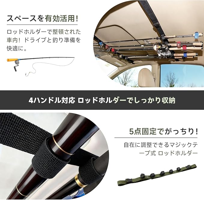 ロッドホルダー 車 ロッドキャリー 5本対応 ロッドベルト 釣り竿固定バンド 調整可能 マジックテープ ワンタッチ取り付け 収納便利 携帯用 車内天井 SUV セダン対応