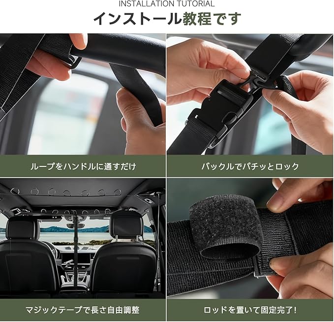 2. ワンタッチ簡単取り付け & 調整可能な長さ 面倒な工具は一切不要!ワンタッチでカチッと留めるバックルと、スライド式のマジックテープで、誰でも30秒で設置完了。バンドの長さは110cm~155cmまで調整可能なので、SUVからセダンまで、あらゆる車種の室内にぴったりフィットします。