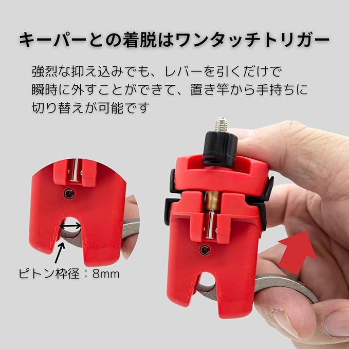 【ワンタッチで瞬時に切り替え可能】 ピトンクランプとロッドキーパーの着脱は、ワンタッチトリガー方式で、強い力がかかる場面でもレバーを引くだけで簡単に外すことができます これにより、置き竿から手持ち竿へのスムーズな切り替えが可能です