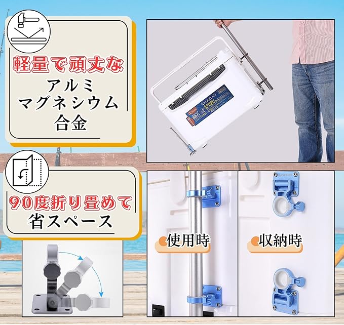 【折り畳み式設計】アルミ製の軽量ボディで、使用時と収納時の切り替えが簡単な折り畳み式ロッドホルダー。