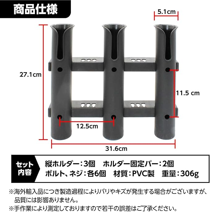 ✅ 【商品仕様、セット内容】縦ホルダー:3個、ホルダー固定バー:2個、ボルト、ネジ:各6個。組み立て後サイズ:縦約27.1cm、横約31.6cm。ホルダー内径:5.1cm。材質:高品質PVC樹脂製。1個重量:306g