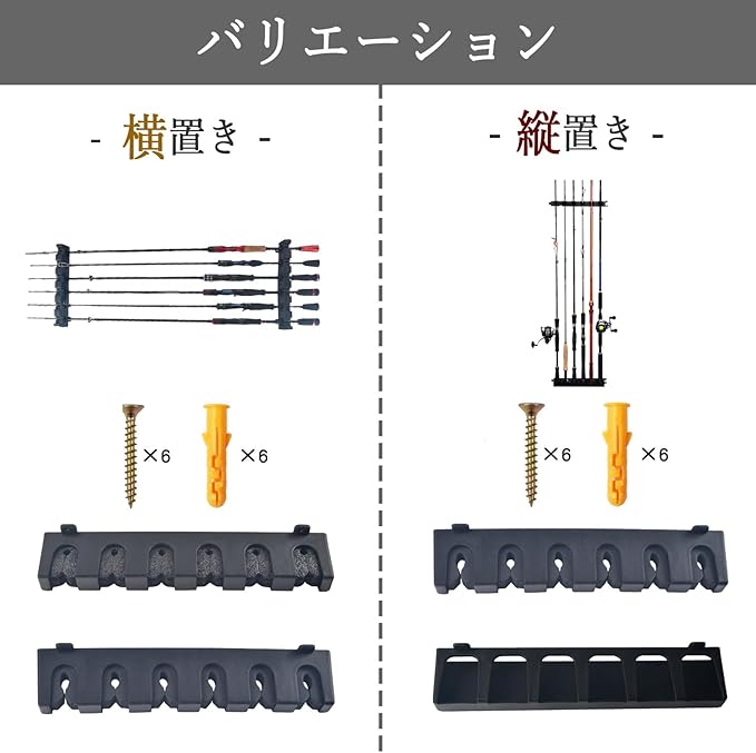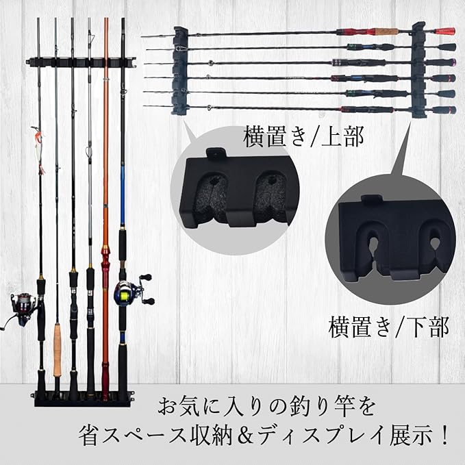 【釣り竿収納に】ご自宅やガレージなどの壁に取り付けて、ロッド6本を水平または垂直に収納可能!お気に入りのコレクションに囲まれる夢のような空間が実現!かさばりがちな釣り道具をスマートに保管できます。