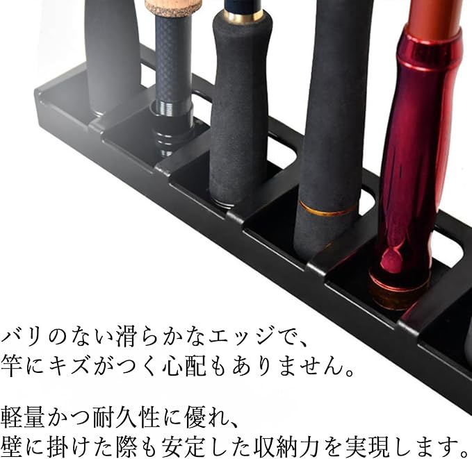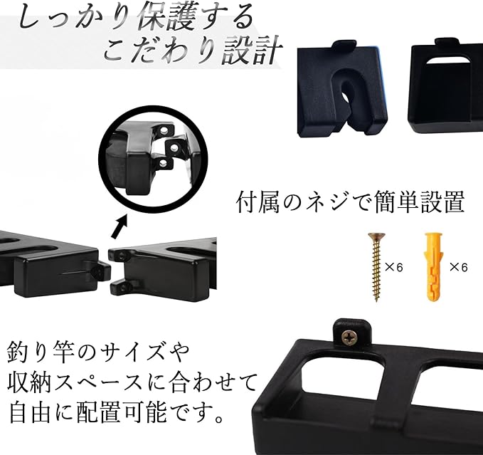 【こだわり設計】軽量かつ耐久性に優れ、壁に掛けた際も安定した収納力を実現します。付属のネジで簡単設置!釣り竿のサイズや収納スペースに合わせて自由に配置可能です。