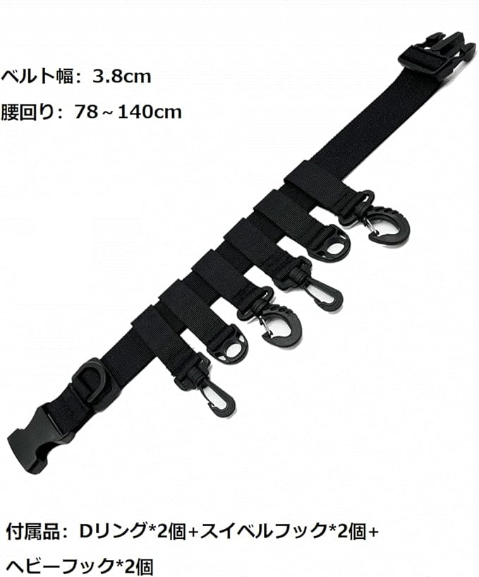 「商品仕様」素材:ナイロン+ABS、カラー:ブラック、サイズ:ベルト幅3.8cm、腰回り:78~140cm、付属品:Dリング*2個+スイベルフック*2個+ヘビーフック*2個+取り外し可能な釣り竿ホルダー*1個