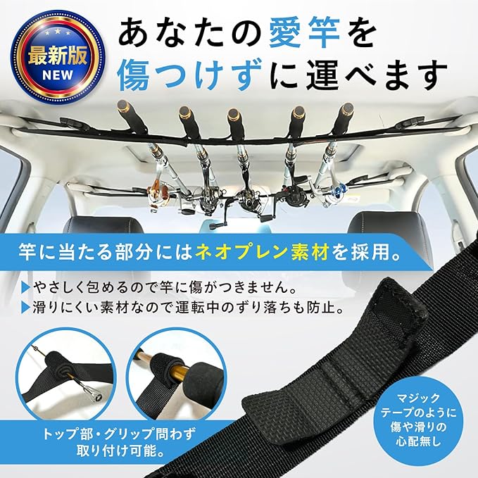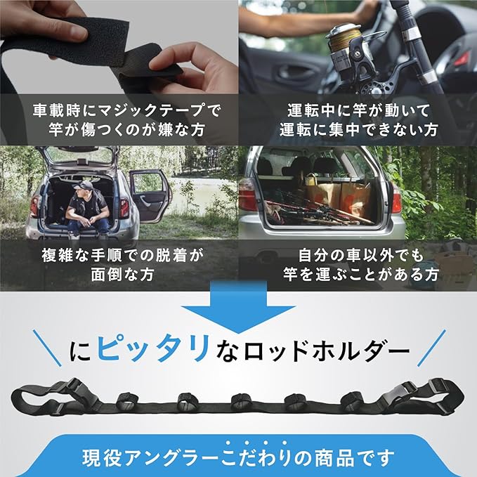 【ロッドがすべらない】フィッシングロッド取り付け部のベルトはグリップ力も抜群のロッドベルトです。マジックテープを使っていて運転中に竿がズレてきて危ない目に遭った方、竿が動いて気になってしまうといった問題を解決しました!最大収納本数5本のたっぷり収納。