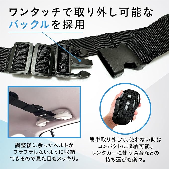 【簡単ワンタッチ取付】取り付けはベルトを通しバックルをカチっとはめるだけで天井スペース有効活用!アシストグリップ付きの車両全般に簡単に装着できます。わかりやすい日本語の取り付け説明書ガイドブック・取り付け動画も付属しています。取り付けにつきましてもお問い合わせいただきましたらご対応いたします。