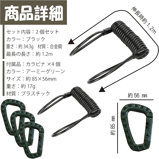 セット内容:2個セット カラー:ブラック 重さ:約34.3g 材質:鉄 最長の長さ:約1.2m 付属品:カラビナ 4個(カラー:アーミーグリーン サイズ:約85 56mm 重さ:約17g 材質:プラスチック) ※モニターの環境等により、色の見え方に若干差が生じる場合がございます。