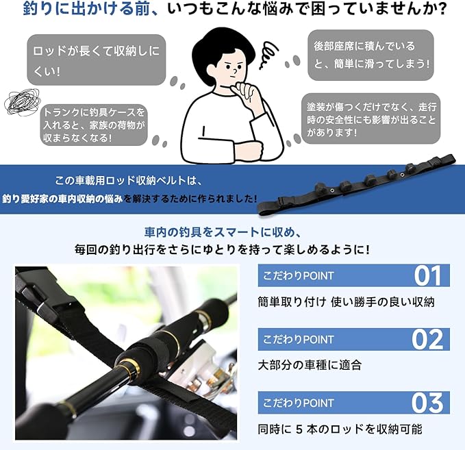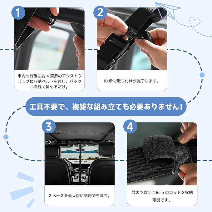 【10 秒で簡単取り付け!】工具は不要で、アシストグリップにベルトを通してバックルを留めるだけで完成。釣り出行前に慌しく手間取ることなく準備ができます。使用しない時は手のひらサイズに巻け、ダッシュボードの隙間やグローブボックスに収納可能で、場所を取らず埃もつきにくいです。