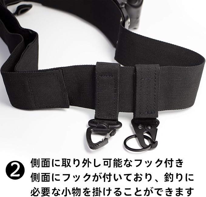 【可動式デザインの吊り穴】オリジナルのD型リング2個が、フックリング、D型吊り下げループ、サイドマウントD型吊り下げループの3つのリングにアップグレードしました。 この追加の吊り下げオプションは、ハサミ、ペンチ、その他の釣り補助具などの釣り道具の収納に役立ちます。