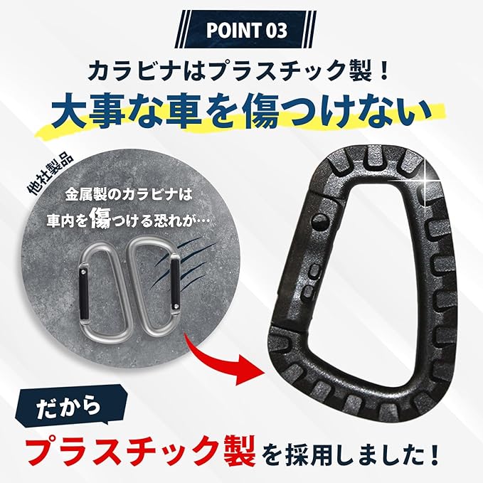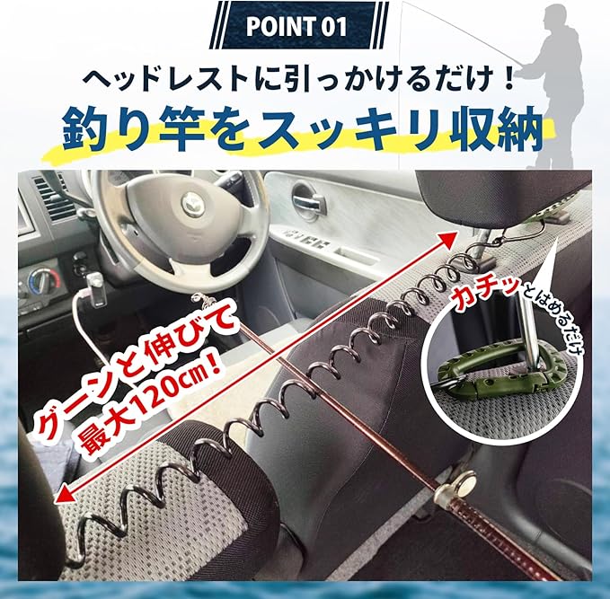 釣り竿や釣り道具の収納に最適です。カラビナ付きで、取り外しが便利なデザイン。耐久性に優れた素材を使用しており、車内のヘッドレストや天井に簡単に固定できます。ジギングロッドやバスロッドにも対応した多機能な収納ソリューションです