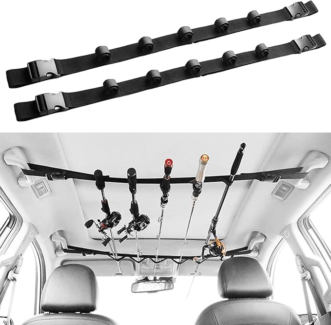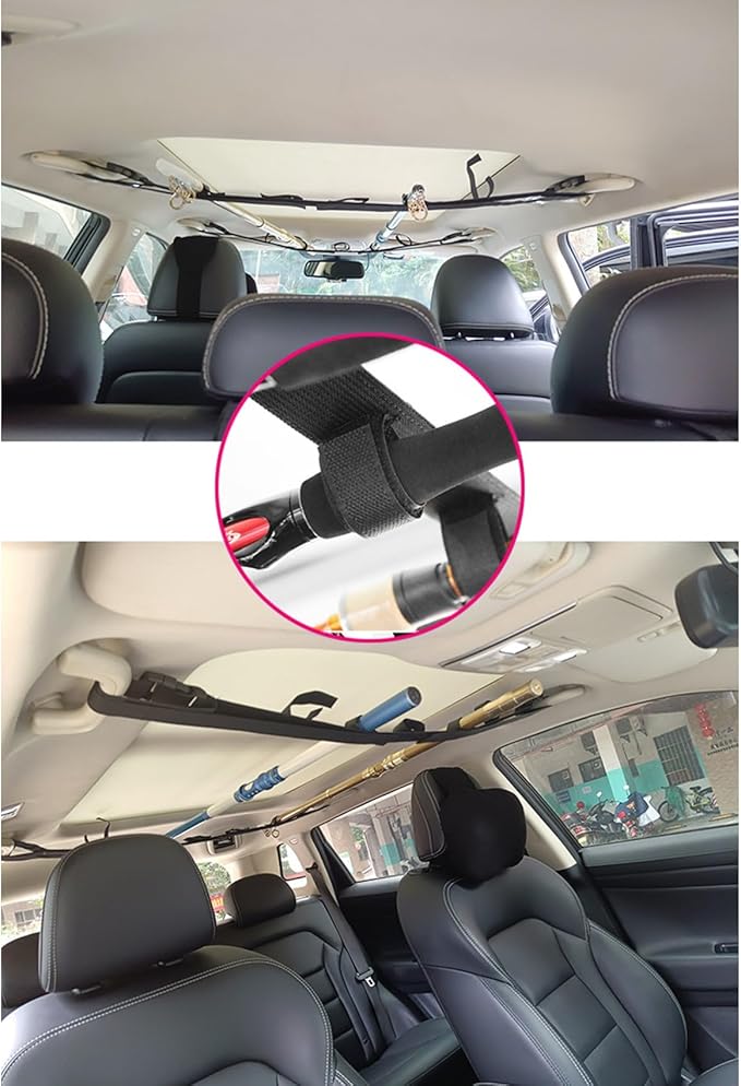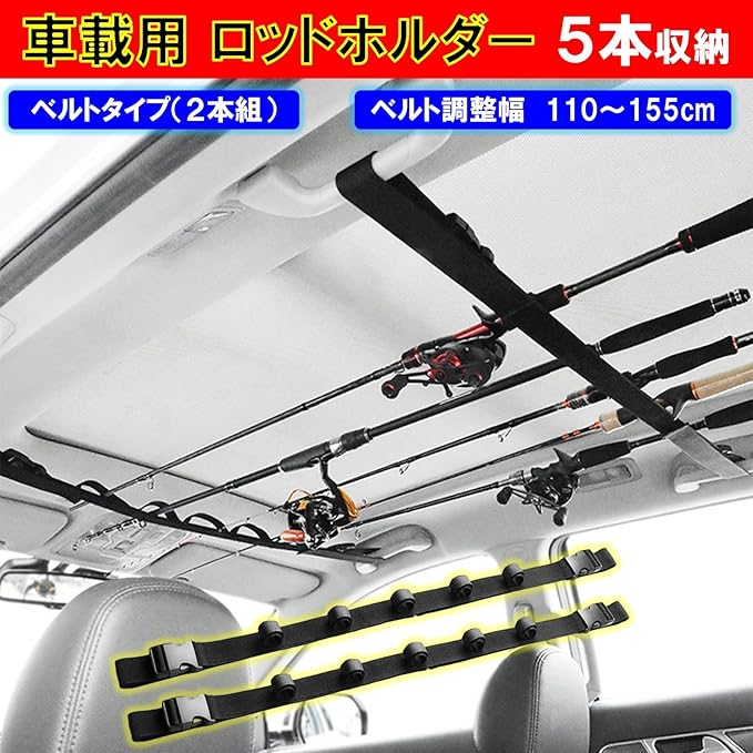 車の天井部分に釣り竿を5本収納できる車載用ロッドホルダーベルトタイプです。高粘着ベルクロで釣り竿をしっかり固定できます。取付けベルトは110~155cm調整可能で様々な車種に適応します。フィッシング、BBQ、キャンプなど多様なシーンでご活用いただける車載用ロッドホルダーです。限られた車内スペースの有効活用にお役立てください。