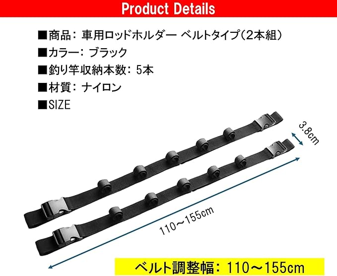 商品詳細: 車載用ロッドホルダー(ベルトタイプ)2本組 【カラー】 ブラック 【材質】 ナイロン 【サイズ】 120 3.8㎝(ベルト調整幅110~155cm)