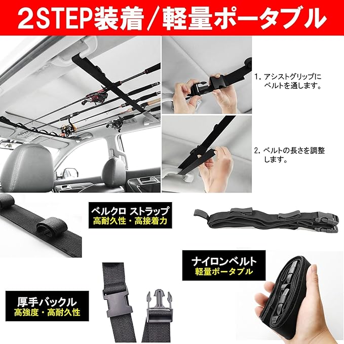 愛車へのロッドホルダーの取り付けはアシストグリップにベルトを通してバックルで留めて、ベルトの長さを調整するだけ2STEPで完了します。使用されない時は、手の平サイズまでコンパクトに畳めますので収納場所にも困りませんし、持ち運びにも便利です。