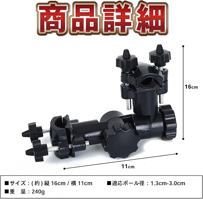 製品サイズ:(約)縦16cm / 横11cm、重量 240g、ホールド可能なポール径 1.3cm~3.0cm。パラソルスタンドとしても使用可能で、様々なメーカーパラソルにも対応します。