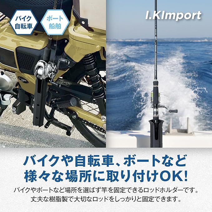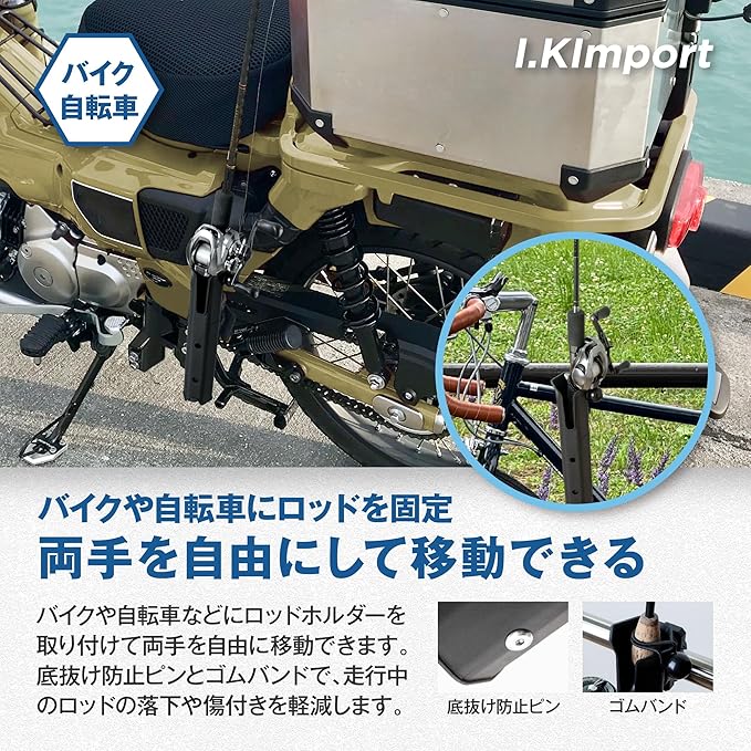 【両手が自由に!安全に釣り場へ移動】 バイクや自転車で釣り場へ向かうときにぴったりのロッドホルダーです。ハンドル横や後部キャリア、フレーム部分などにしっかり固定できるので、両手が空いて安全に移動できます。車では行きにくい場所にも気軽に出かけられ、目的地までロッドをスムーズに持ち運べるのが特長です。振動や揺れにも強く、大切なロッドをしっかり保持できます。