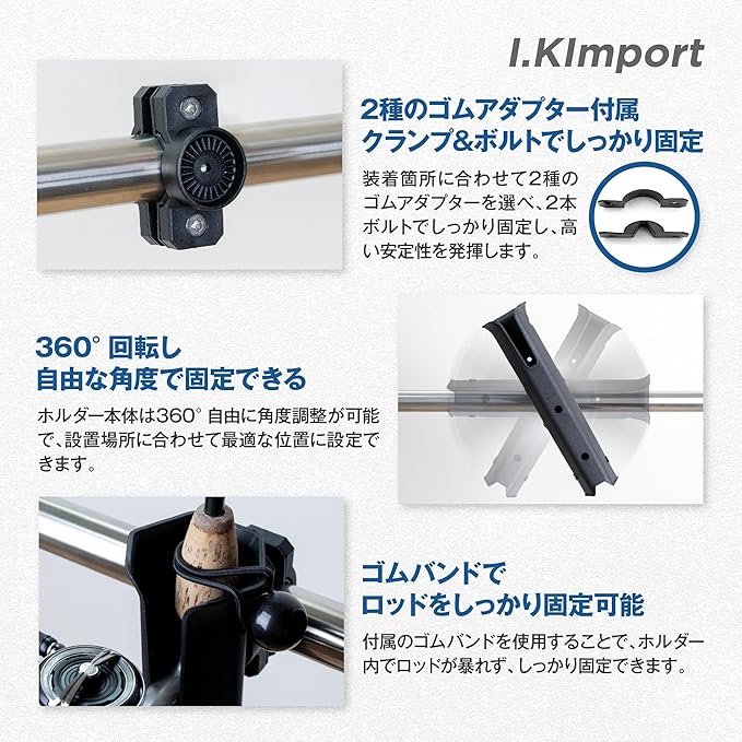 【角度も高さも自由自在。使いやすさを徹底追求】 ロッド差し込み口は360 回転し、横向きや斜めなど好みの角度に調整できます。さらに高さは3段階で変更でき、ロッドや場所に合わせて最適な位置にセット可能。低めにして安定感を重視したり、高めにして視認性を上げたりと使い分けできます。角度も高さも自由に変えられるため、さまざまな場面で扱いやすいホルダーです。