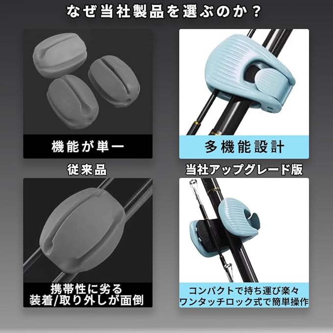 【ワンタッチで簡単固定】独自の調整可能なクリップ設計により、釣り竿の束ねと固定がわずか1秒で完了。面倒な結び作業は不要で、効率的な収納と取り出しを実現します。釣り場での準備時間を大幅に短縮する便利グッズです。