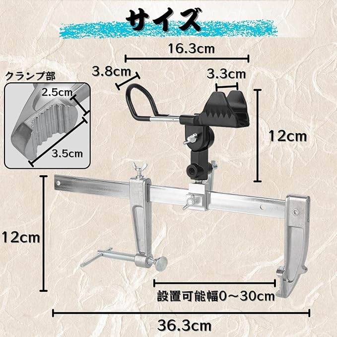 最大固定幅が30cmまで広がるため、投げ竿やルアーロッドなど、多くの種類の竿をサポートします。なお、本製品には取り付けサポートは含まれておりません。