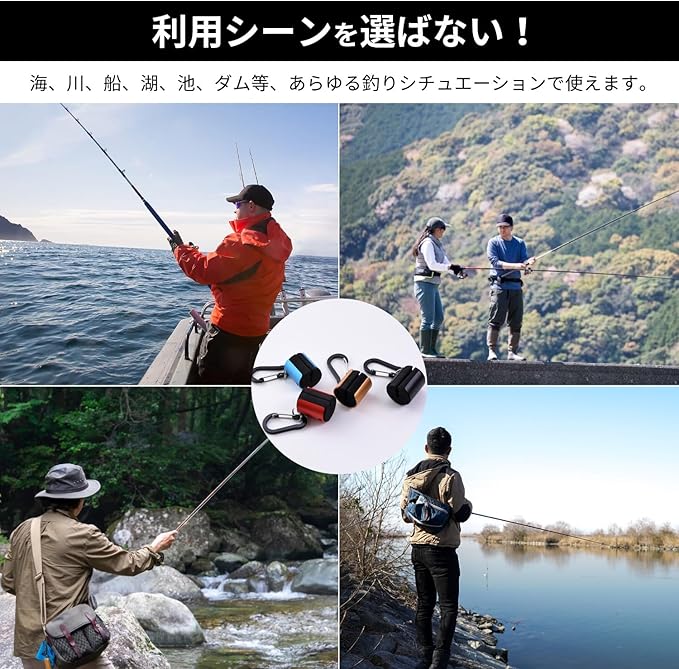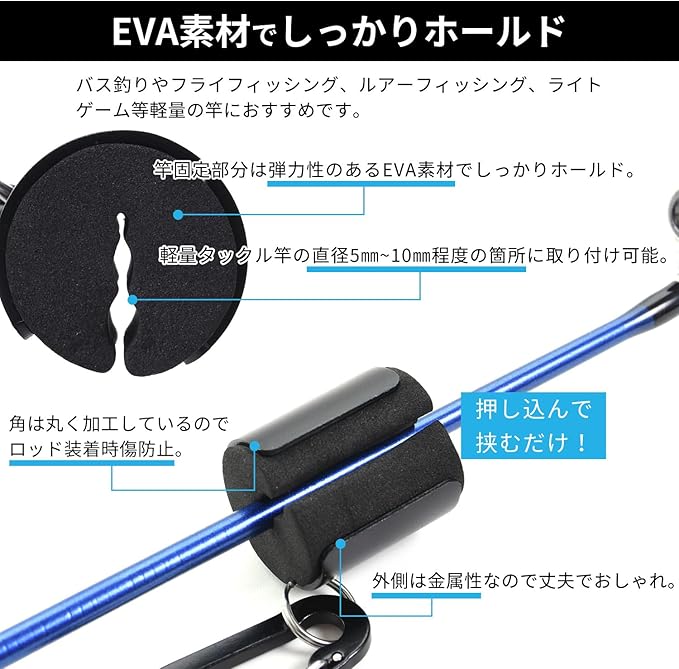 【スタイリッシュで使い勝手抜群】外装は金属でできており頑丈かつカッコ良いデザインです。ロッド保持部分は高品質のEVA素材でやわらかく、弾力性もあり竿をしっかり竿をホールドしてくれます。取り付けはカラビナなので腰や胸やベスト、ベルト、ウエストポーチ、リュック等お好きな箇所に簡単に取り付けることができます。