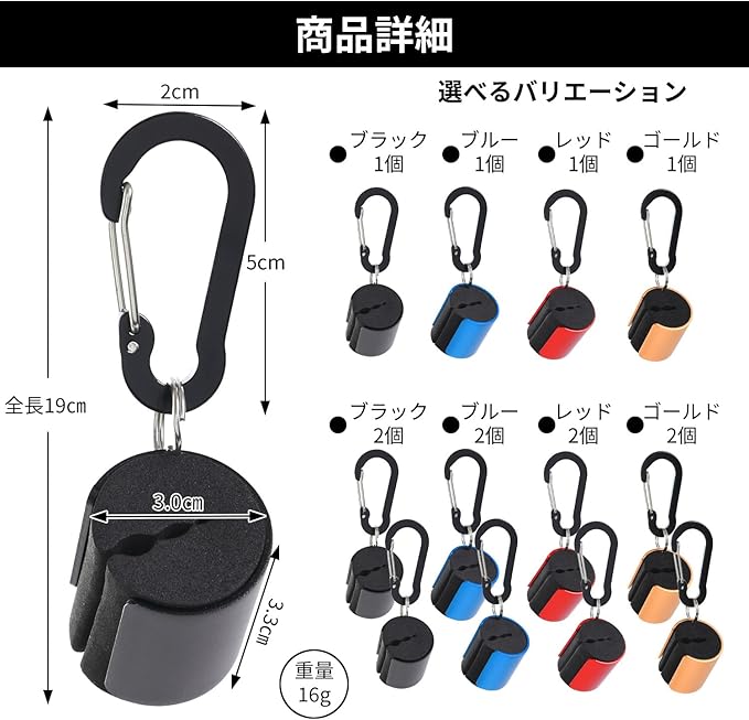 【サイズ】全長19㎝(ホルダー部)幅3.0㎝長さ3.3㎝(カラビナ部)幅2㎝長さ5cm(重量)16g 【個数】1個セット 2個セット【カラー】黒、赤、青、金