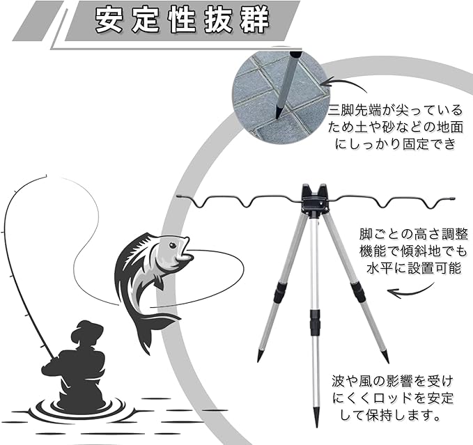 【安定性抜群】三脚先端が尖っているため土や砂などの地面にしっかり固定でき、脚ごとの高さ調整機能で傾斜地でも水平に設置可能、波や風の影響を受けにくくロッドを安定して保持します。