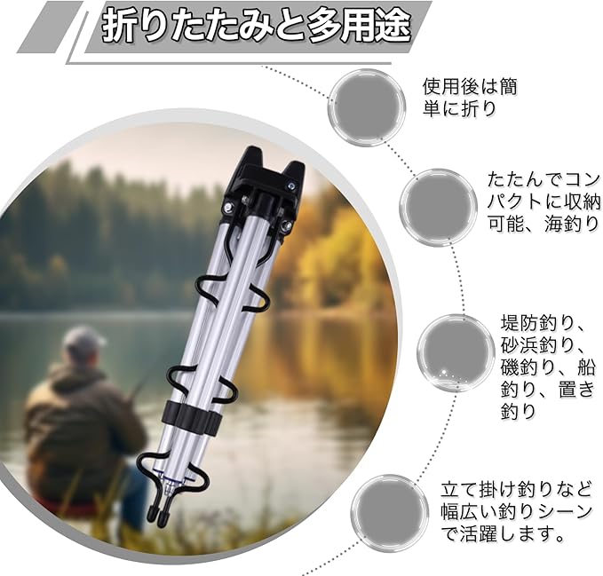 【折りたたみと多用途】使用後は簡単に折りたたんでコンパクトに収納可能、海釣り、堤防釣り、砂浜釣り、磯釣り、船釣り、置き釣り、立て掛け釣りなど幅広い釣りシーンで活躍します。