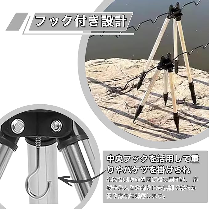 【フック付き設計】中央フックを活用して重りやバケツを掛けられ、複数の釣り竿を同時に使用可能、家族や友人との釣りにも便利で様々な釣り方法に対応します。