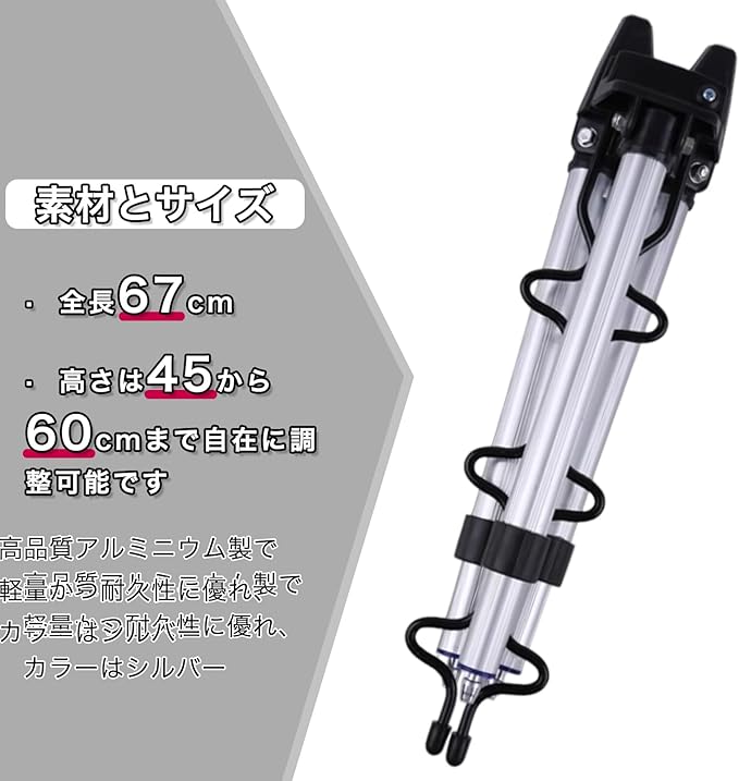 【素材とサイズ】高品質アルミニウム製で軽量かつ耐久性に優れ、カラーはシルバー、全長67cm、高さは45から60cmまで自在に調整可能です。