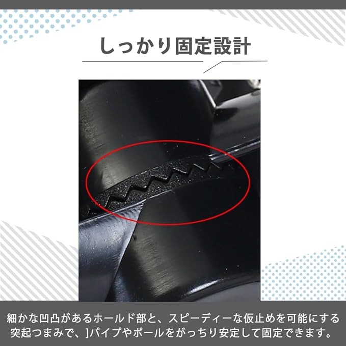 【しっかり固定設計】細かな凹凸があるホールド部と、スピーディーな仮止めを可能にする突起つまみで、パイプやポールをがっちり安定して固定できます。