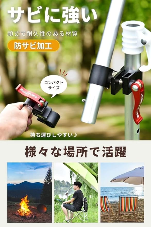 【注意事項】締付けしばらくした後に緩みが無いかをご確認ください。緩みがあるようですと増し締め等をお願いいたします。釣り等のレジャーの補助具としてご使用ください。強風時やその他、構造物の組み立て固定にはご使用されない様お願いいたします。
