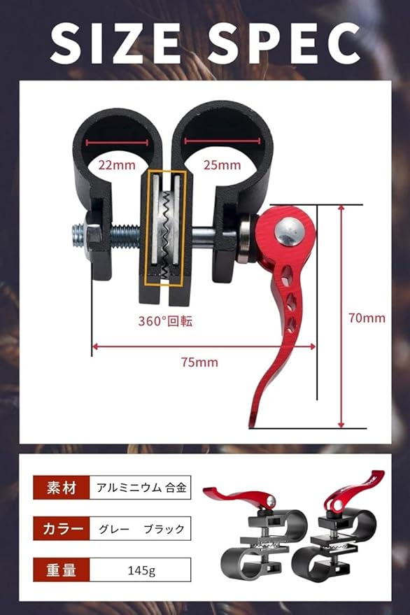 【商品説明】アルミニウム合金製 角度調整ジョイントホルダーです。φ25mmの支柱とφ22mmの支柱の角度調整および固定が可能となります。ジョイント部分は360度回転するため、お好みの角度での調整、固定が可能です。また、本体表面は防錆加工が施されており、サビに強く、高い耐久性を兼ね備えています。ヘラブナ釣りのみでなく、海水浴やキャンプ、レジャーなどの幅広い場所でご愛用されております。