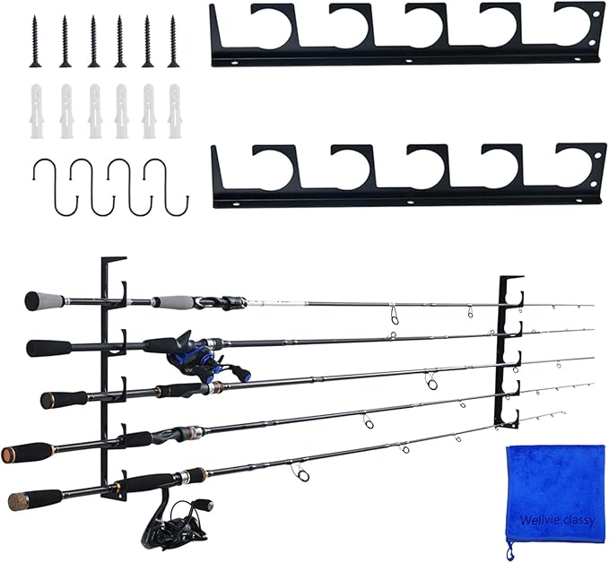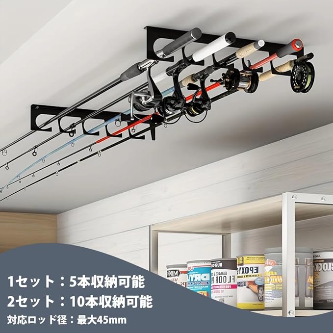 最大5本の釣り竿を収納できる、壁掛け・天井取リ付け対応のロッドホルダー。