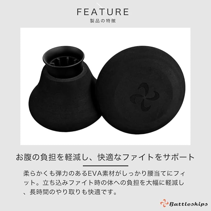 【安定性を重視した丸型ベース設計】底面は接地面積の広い丸型形状。体へのフィット感と安定性を両立し、ファイト中のズレやブレを最小限に抑えます。バトルシップスオリジナルロゴも配置し、細部までこだわり抜いた設計です。