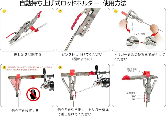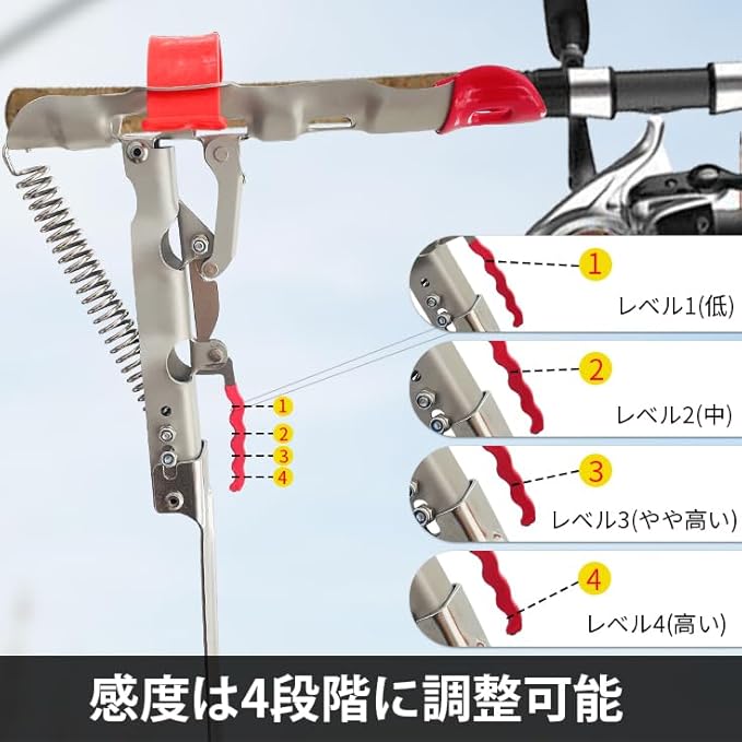 【アルミ合金素材】ロッドホルダー全体はアルミ合金素材で作られたため、高強度で高耐久性を持っています。長時間に使用するのに対応。表面にメッキ加工を施されております。金属感に溢れ、サビを効果的に防止させ、劣化しにくく、アウトドアイベントに最適。高感度レバーが付いているので、魚がいる時すぐに跳ね上がることで、手動でロッドを引き上げる必要がなく、長時間の釣りでも手や腕の疲れを軽減できます。