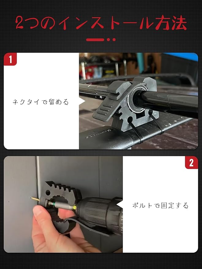 【取り付け簡単】スコップホルダーには、2つ簡単な取り付け方法があり、ネジを使って壁やパネルなどの平らな面に取り付けることも、ストラップを使ってバーのルーフラックに取り付けることもできる。
